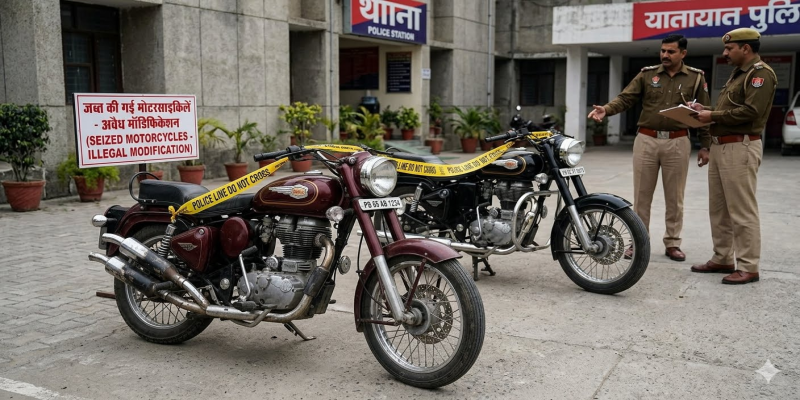 भगवानपुर। पुलिस ने सड़क पर पटाखे छोड़ने और मॉडिफाइड साइलेंसर का इस्तेमाल करने वाले वाहनों के खिलाफ कार्रवाई कर दो बुलेट सीज कर दी। पुलिस को सूचना मिल रही थी कि कुछ युवक साइलेंसर में बदलाव कर पटाखे जैसी आवाज निकाल रहे हैं, जिससे राहगीरों को परेशानी हो रही है। अभियान चलाकर पुलिस ने दोनों बाइकों को रोका। जांच में वाहन बिना रजिस्ट्रेशन, बिना हेलमेट और मॉडिफाइड साइलेंसर के पाए गए। वरिष्ठ उप निरीक्षक रमेश सैनी ने बताया कि दोनों बाइकों को सीज कर बाइक सवार युवकों को सख्त चेतावनी दी गई है। उन्होंने कहा कि आगे भी ऐसा करने पर कड़ी कार्रवाई की जाएगी।